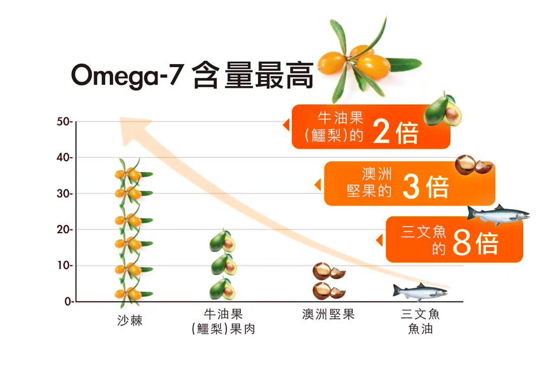Omega-7一般只能透過魚油、沙棘果及澳洲堅果攝取。而沙棘就是大自然界的所有食物中Omega-7含量之冠。黃金沙棘的Omega-7濃度可高達40%,是澳洲堅果的3倍、三文魚的8倍!